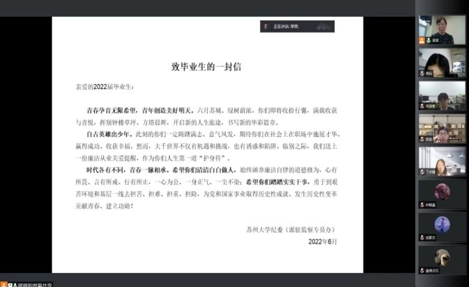 68日中午,材料与化学化工学部纪委书记李乐通过线上线下相结合的形式,对毕业生开展廉洁从业教育。李乐以“树正世界观,筑牢信念的压舱石”为主题对各位毕业生党员开展了毕业廉洁教育。李乐从“小心踩上违法乱纪的雷区!”“初入社会,这些心态不可有!”“增强“免疫力”,职务犯罪不找你!”“整理了半年的书单,拿走拿走别客气!”“低龄犯罪真实案例,背后竟有这么多故事“五个方面展开讲述。她从职务犯罪的定义、立案标准、职务犯罪类型等方面,让毕业生党员们清楚地知道何种行为是法律所不允许的职务犯罪行为,为即将走上工作岗位的毕业生党员们敲响了警钟。接着,她分享了廉洁书单,提醒毕业生党员们要时刻自省,守住初心。随后,李乐用90后青年职务犯罪的典型案例,提醒毕业生党员们要时刻绷紧廉洁自律这根弦,增强自身“免疫力”。然后,她从把住“六道关口”、算好“七笔大账”、管住“七个部位”三个方面,提醒毕业生党员如何预防职务犯罪。