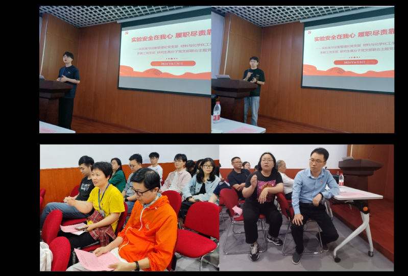 研究生高分子党支部的学生安全员代表分享了从事安全员工作以来的收获、体会、学习成长经历;畅谈了对实验室安全员岗位重要性的理解、对岗位职责的深刻认识以及今后的努力方向。高分子系教工党支部教师代表发言表示,实验室安全是保障每个人生命和健康的基石,不仅要熟悉实验室的安全管理,关注实验室的安全状况和环境,更要确保实验室操作的规范性、预防事故的发生,尤其要重视学生的安全培训教育。