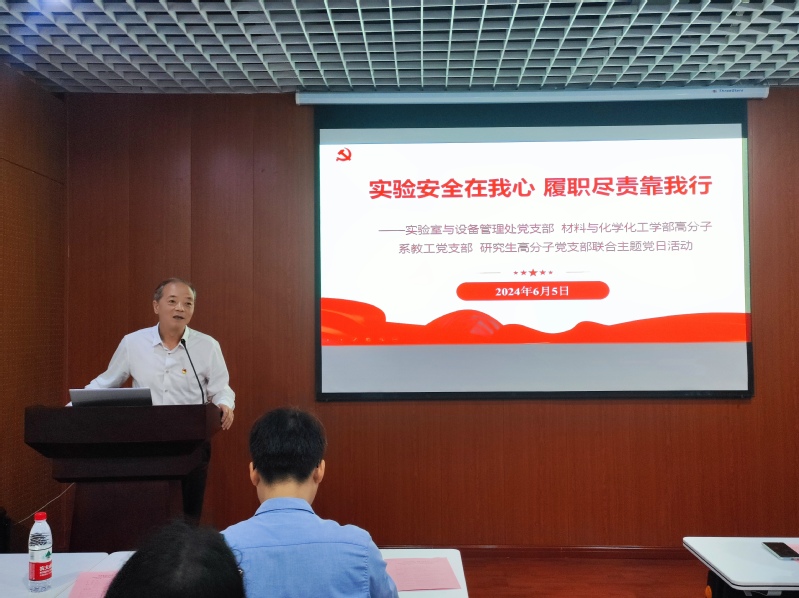 今年6月是第23个全国“安全生产月”,为进一步深入学习贯彻党的二十大精神,以及习近平总书记关于安全生产的重要论述和重要指示批示精神,以党建引领助推实验室安全,持续树牢安全红线意识,6月5日,实验室与设备管理处党支部与学部高分子系教工党支部、研究生高分子党支部联合共同举办“实验安全在我心,履职尽责靠我行”实验室安全宣讲主题党日活动。实验室与设备管理处党支部书记魏永前、材料与化学化工学部党委书记李翔、高分子系教工党支部书记何金林、研究生高分子1党支部书记耿德佳、研究生高分子2党支部书记朱迪,以及双方党员、学生安全员代表参加了此次活动。