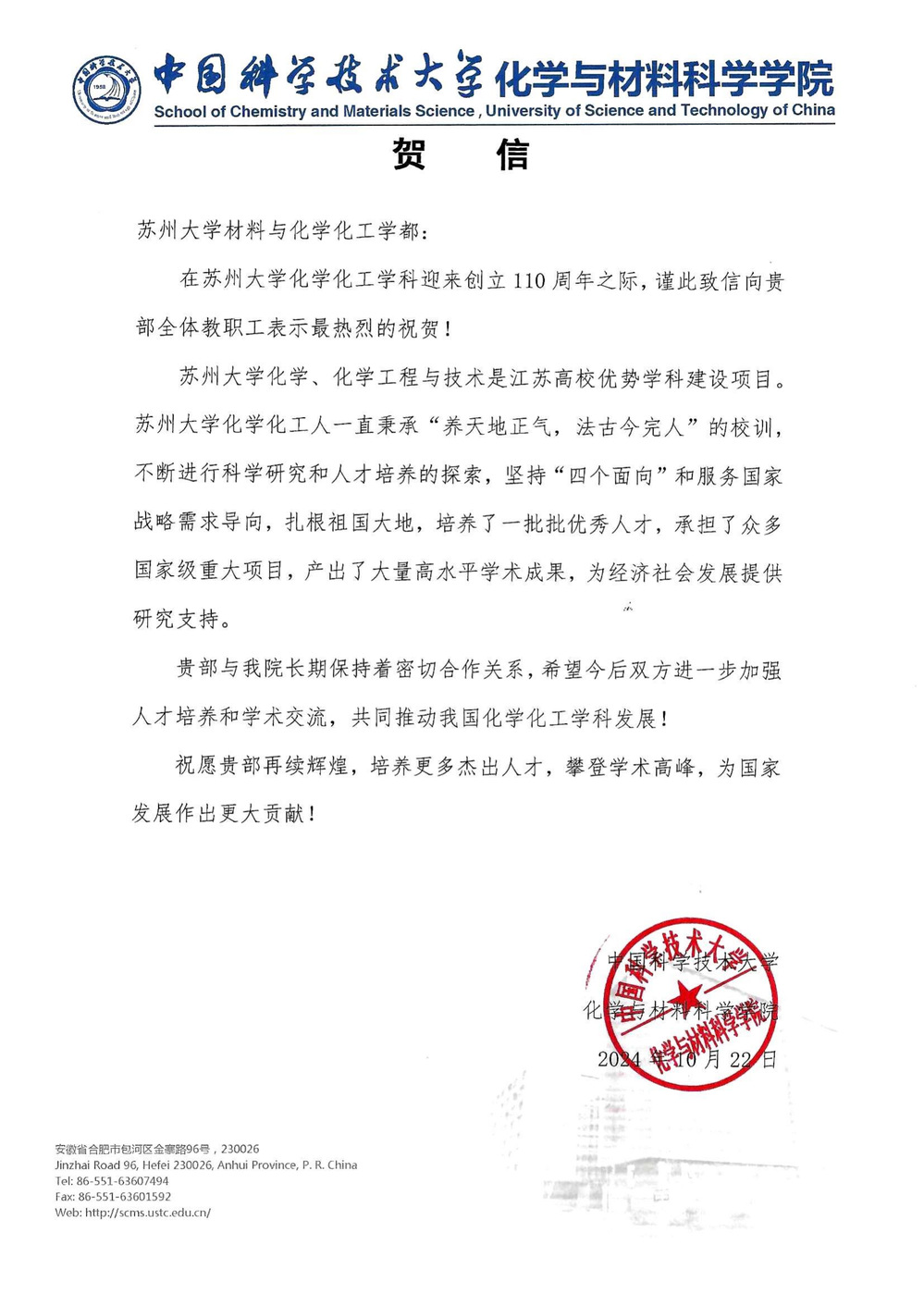 中国科学技术大学化学与材料科学学院贺信