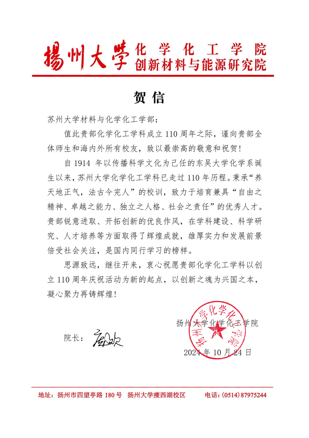扬州大学化学化工学院贺信
