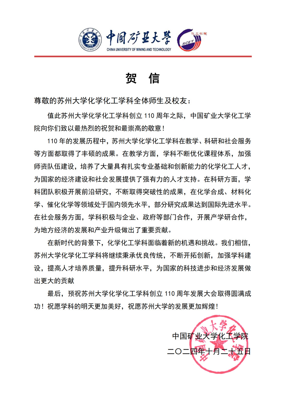中国矿业大学化工学院贺信
