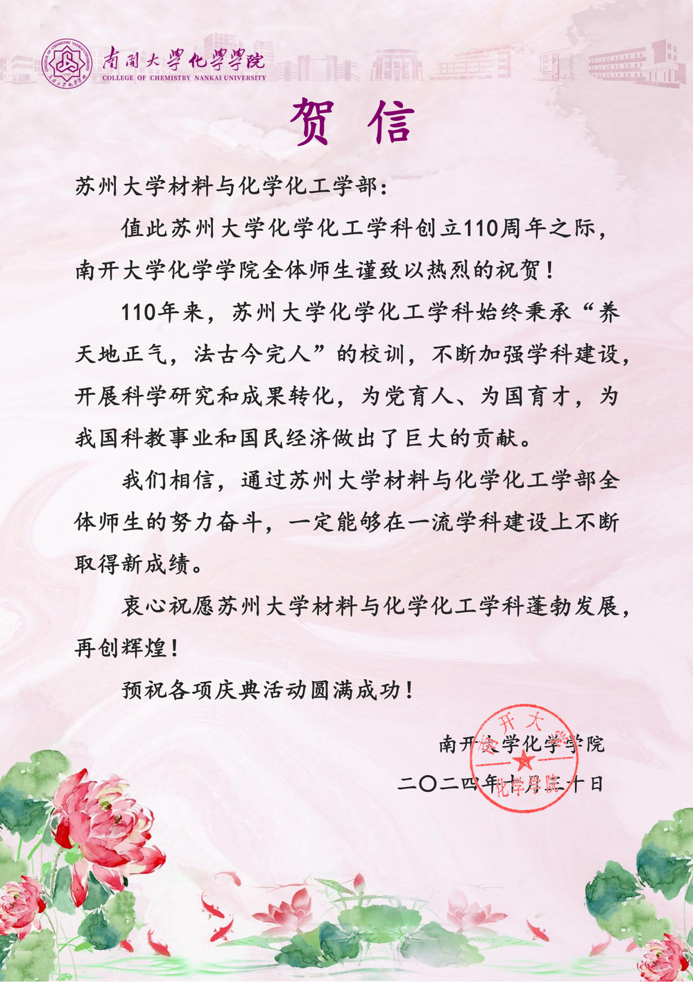 南开大学化学学院贺信