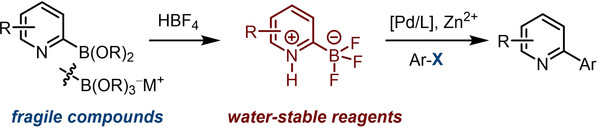 Abstract: The stability of 2-pyridylation reagents is a long-standing issue in cross-coupling chemistry due to hydrolysis. However, as the use of pyridine-based pharmaceuticals continues to increase, there is a high demand for stable and reactive 2-pyridylation reagents. Herein, a general strategy to prepare water-stable 2-pyridylboron reagents has been developed. The application of the water-stable 2-pyridylboron reagents in a neutral Suzuki-Miyaura coupling with a halide scavenger enables an efficient 2-pyridylation reaction of aryl halides.