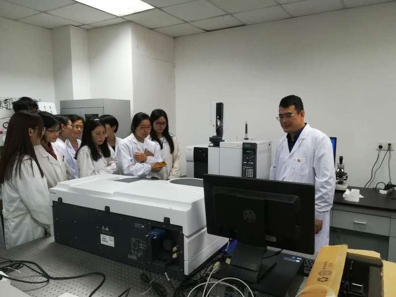 之后,张老师引领大家参观测试和表征实验室。在实验室中,张老师逐一介绍大型的测试仪器。包括气-质联用色谱仪、高温凝胶渗透色谱仪、稳态/瞬态荧光光谱仪、紫外-可见-近红外吸收光谱仪、红外光谱仪、热重分析仪等。同时,为大家简单介绍了仪器的性能。气-质联用色谱仪仪器能有效的对有机化合物进行定性和定量分析;高温凝胶渗透色谱仪主要用来测定高聚物的分子量;稳态/瞬态荧光光谱仪、紫外-可见吸收光谱仪、红外光谱仪等光学仪器主要是用来测物质的荧光光谱、荧光寿命、吸收光谱和红外光谱。同学们对这些大型仪器很感兴趣,纷纷向张老师请教,张老师也耐心为大家解答。大家都表示,虽然实验室之间的物理距离很近,但是难得有机会可以这么近距离的去了解其他实验室的科学仪器,以及了解其原理,支部活动为大家拓宽科研视野,促进课题组之间的交流提供了很大的帮助。