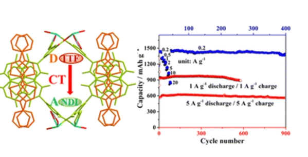 Abstract: Electron donor tetrathiafulvalene (TTF) and electron acceptor naphthalene diimide (NDI) derivatives were used to synthesize a 3D Zn-TTF/NDI-MOF. Multiple redox active sites and charge transfer endow the pristine MOF anode with excellent rate behavior and long term cycling performance (with an average specific capacity of 956 mA h g−1 at 1 A g−1 over 600 cycles). This study highlights the great potential of elaborately-designed MOFs for developing efficient anode materials.